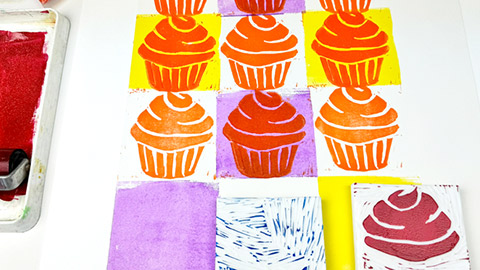If you opted for multiple printing blocks for your design, ink the blocks in the desired ink colours. Starting with the top of the cupcake, print this on top of the background by lining up the square edges again. Take the bottom of the cupcake, then print it on top, ensuring it is also aligned to the background