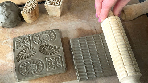 Cut out a square slab (approx 10 x 10cm), which can then be used to make structures such as plates, tiles or pots. Impress into your slab using impression stamps or pattern rolling pins.