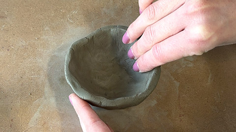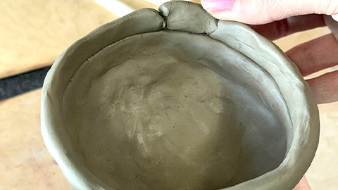 Place a coil on the top of your pinch pot around the edge, and gently, using your thumb and fingers, blend the first coil on the inside and outside of the pot.