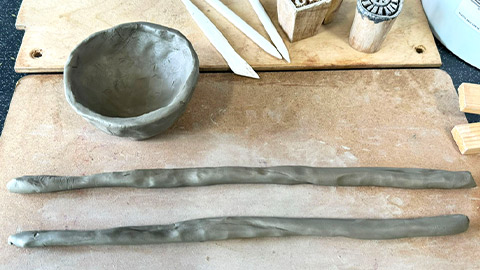 Coiling is shaping clay by rolling out long ‘sausage like’ coils, which can then be joined together to form a structure. You can add to a pinch pot to give it height and add to its shape. First, prepare your coils by rolling out long pieces of clay.