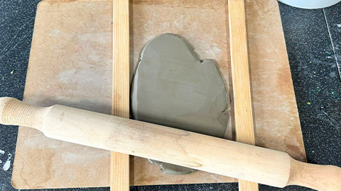 A clay slab is a piece of clay rolled or flattened into a sheet. They can be made by using a rolling pin or slab roller. Wedge a piece of clay and roll out your slab to the desired size. You can use rolling guides to help get an even thickness