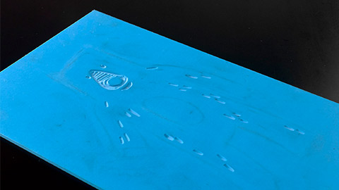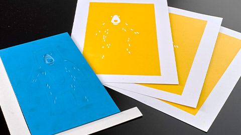 After the first print run, clean and dry your lino. Next, cut out the areas of lino which are to remain as the first print colour. The lino is inked up in a second colour and printed over the top of the first colour, positioning the paper using the registration frame. After the second print, clean and dry your lino.