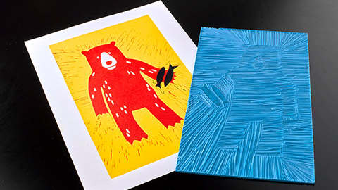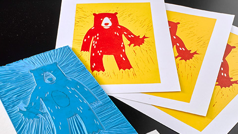 Carve away all areas of the design that will remain white. In this linocut, the bear’s eyes and fur highlights are being carved away first. Remember, lino cutters are sharp! Always cut away from you and keep your hands away from the direction of the blade. A safety guard or bench hook can aid in holding lino safely in place whilst cutting. If using traditional lino, this is easier to work with when it is more flexible, try warming it with a hairdryer before use.