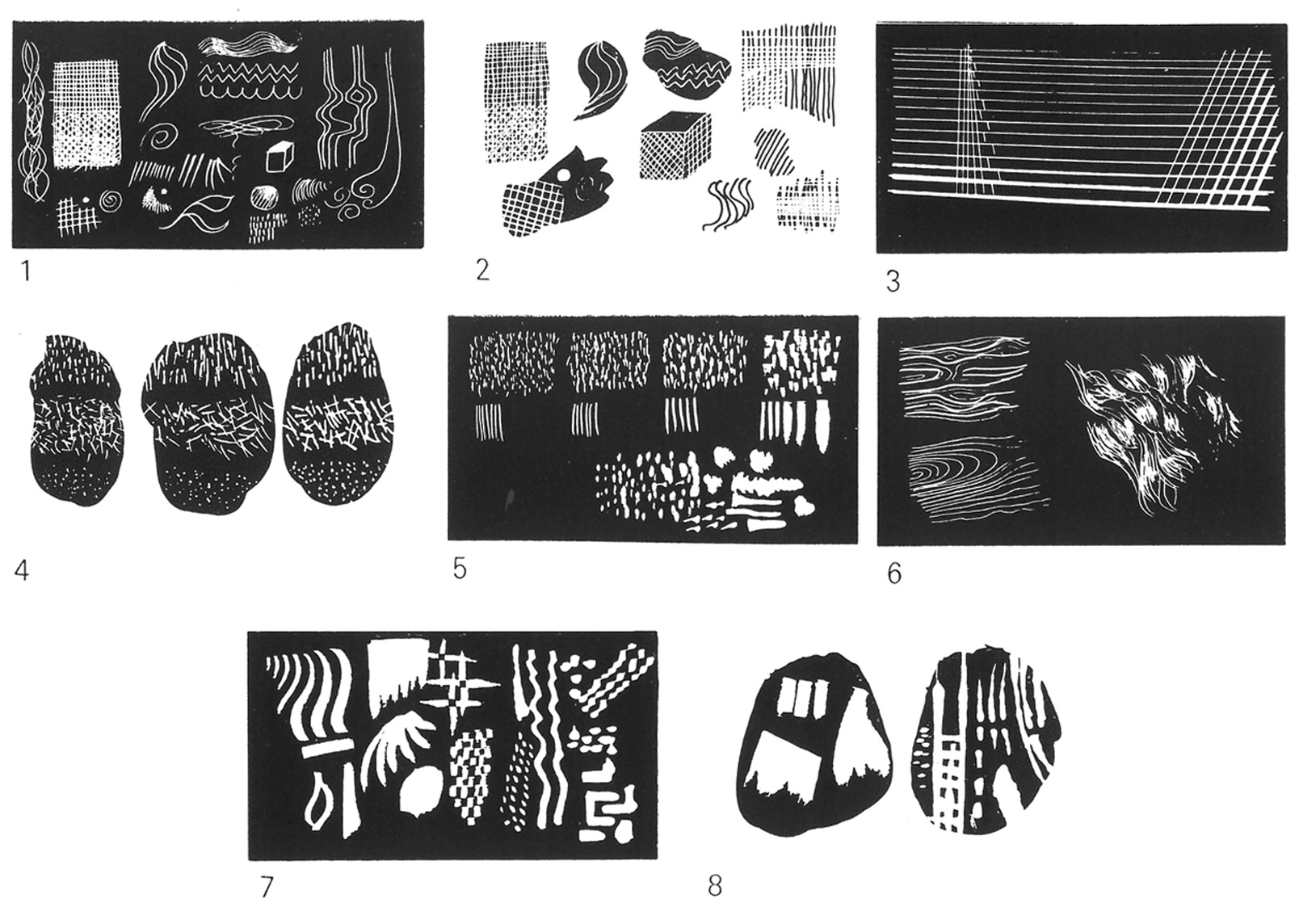 4. Random patterns on white scraperboard using tools A, B and C.