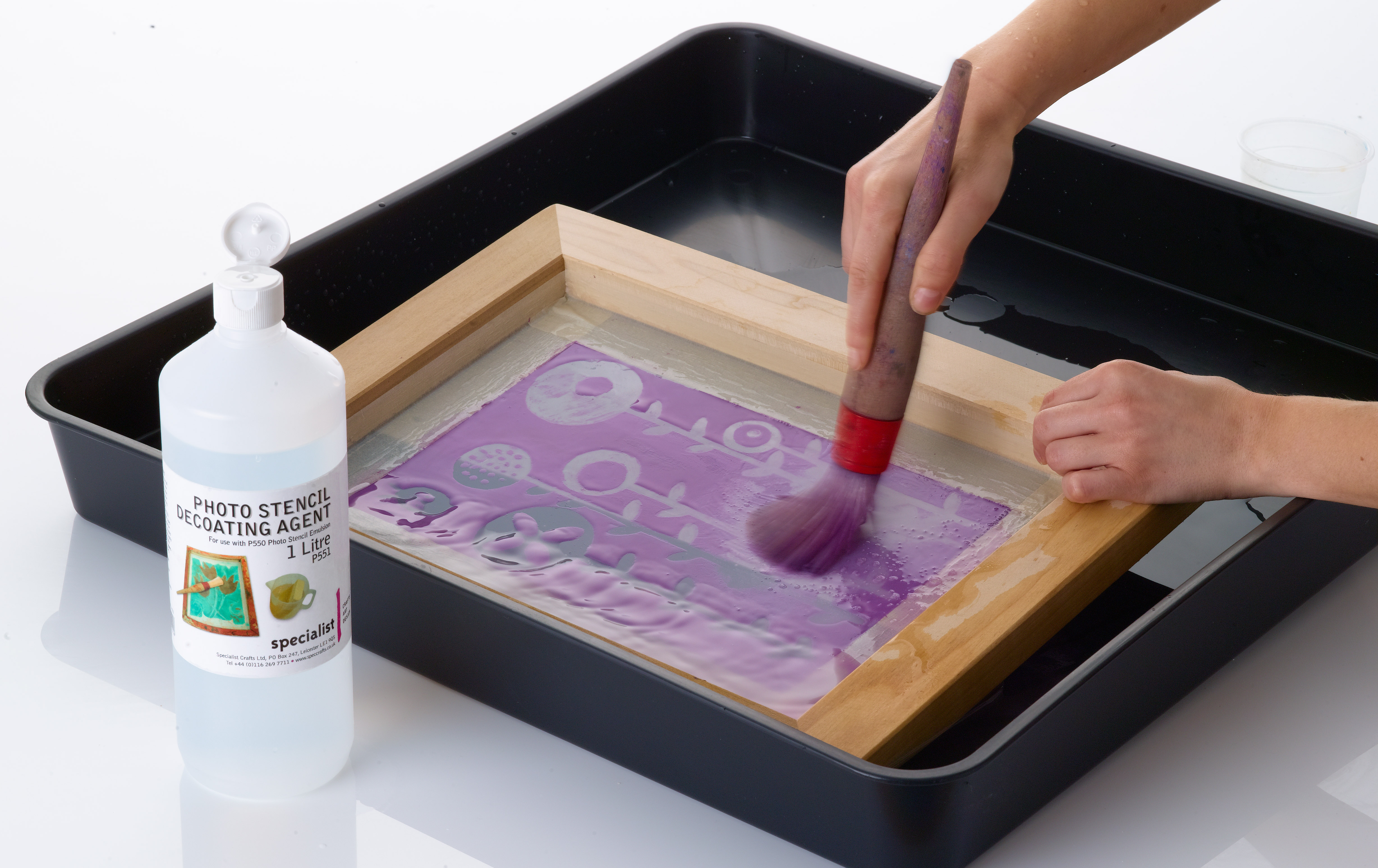 If the stencil emulsion has cured to a rubbery finish, then De-Coating Agent can be applied to reclaim the screen. Brush the agent on to the screen making sure that the entire stencil is covered. Lay the screen into a tray containing De-Coating agent and allow to soak with the mesh fully submerged for 15 minutes. This process is important because, once the agent is applied, it will begin to thin the emulsion by reacting with, and dissolving, the surface layer. If the stencil is left exposed to the air at this stage of the process, the emulsion will begin to dry and solidify. Once this happens the stencil is difficult to remove and may need jet washing.