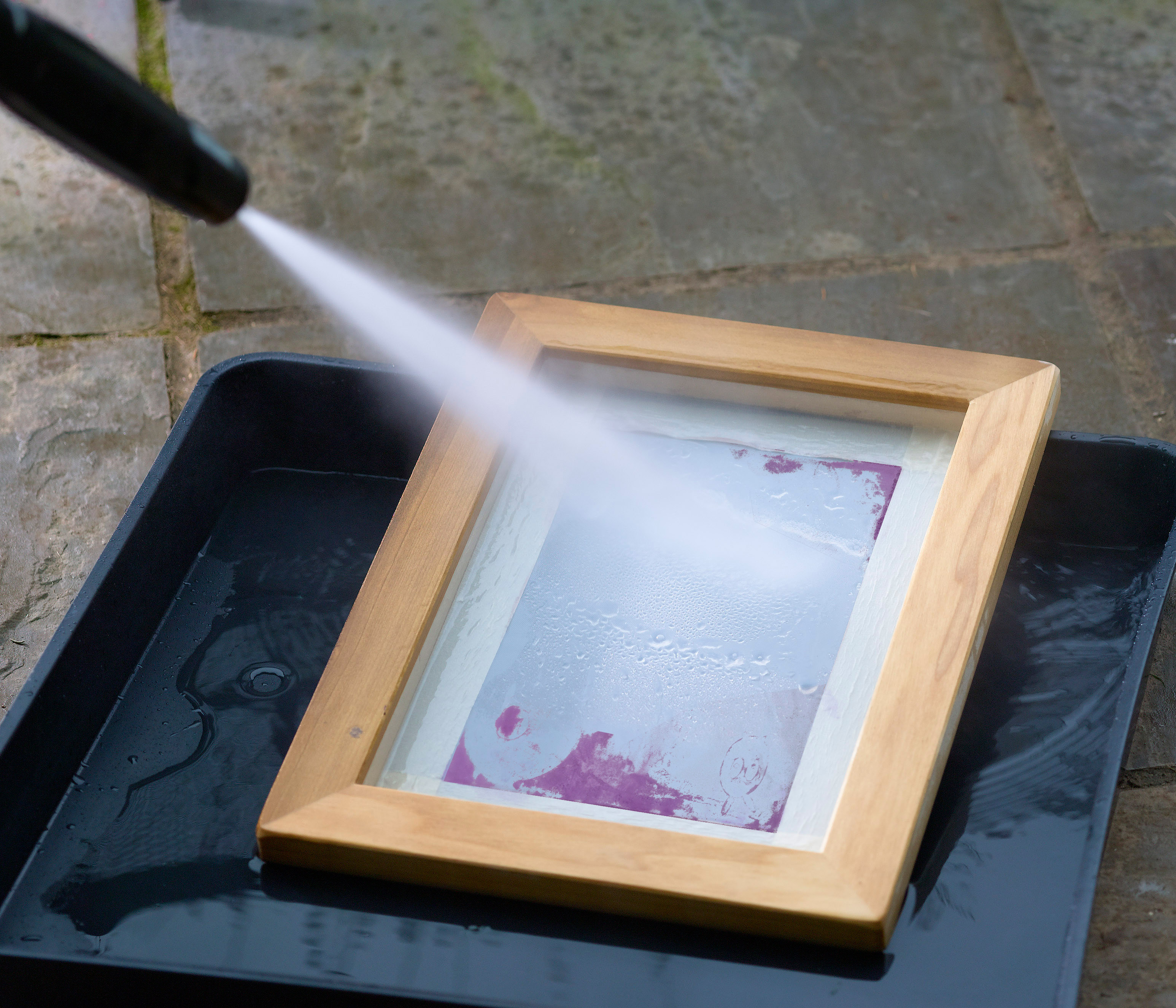 When the stencil emulsion has cured to a hard, plastic finish, then a Pressure Washer must be used to reclaim the screen. Position the screen upright in a spray booth or other suitable location where the water jet will not damage the surroundings and can drain away. Wedge it in to a corner for added support, as the power of the pressure washer can move it around.