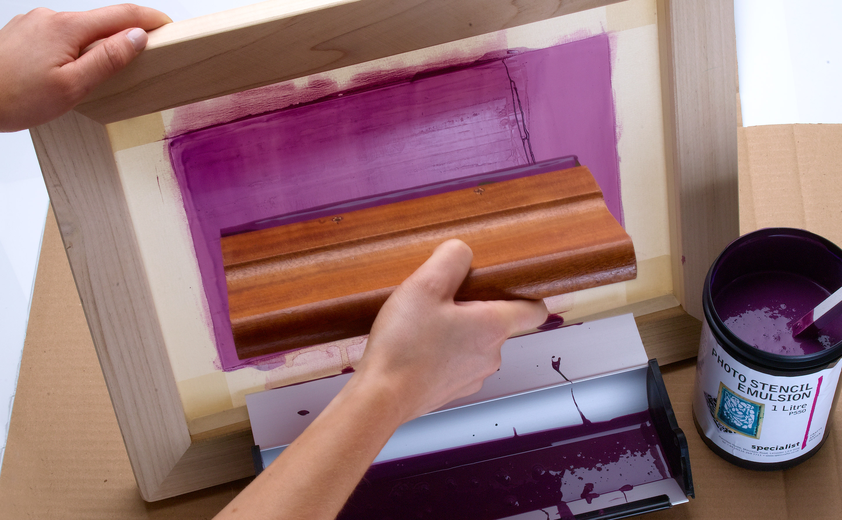 Pour some emulsion into a coating trough and, holding the trough handle in one hand and the screen in a vertical position in the other, draw the emulsion up the screen to coat. Use a squeegee to remove excess emulsion from both sides of the screen until the coating is completely even.