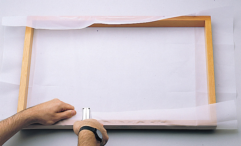 3. Using a sharp knife or scalpel, cut the mesh away from the outside of the frame then release the mesh edges from the rack screen stretcher. The screen is ready to mask.