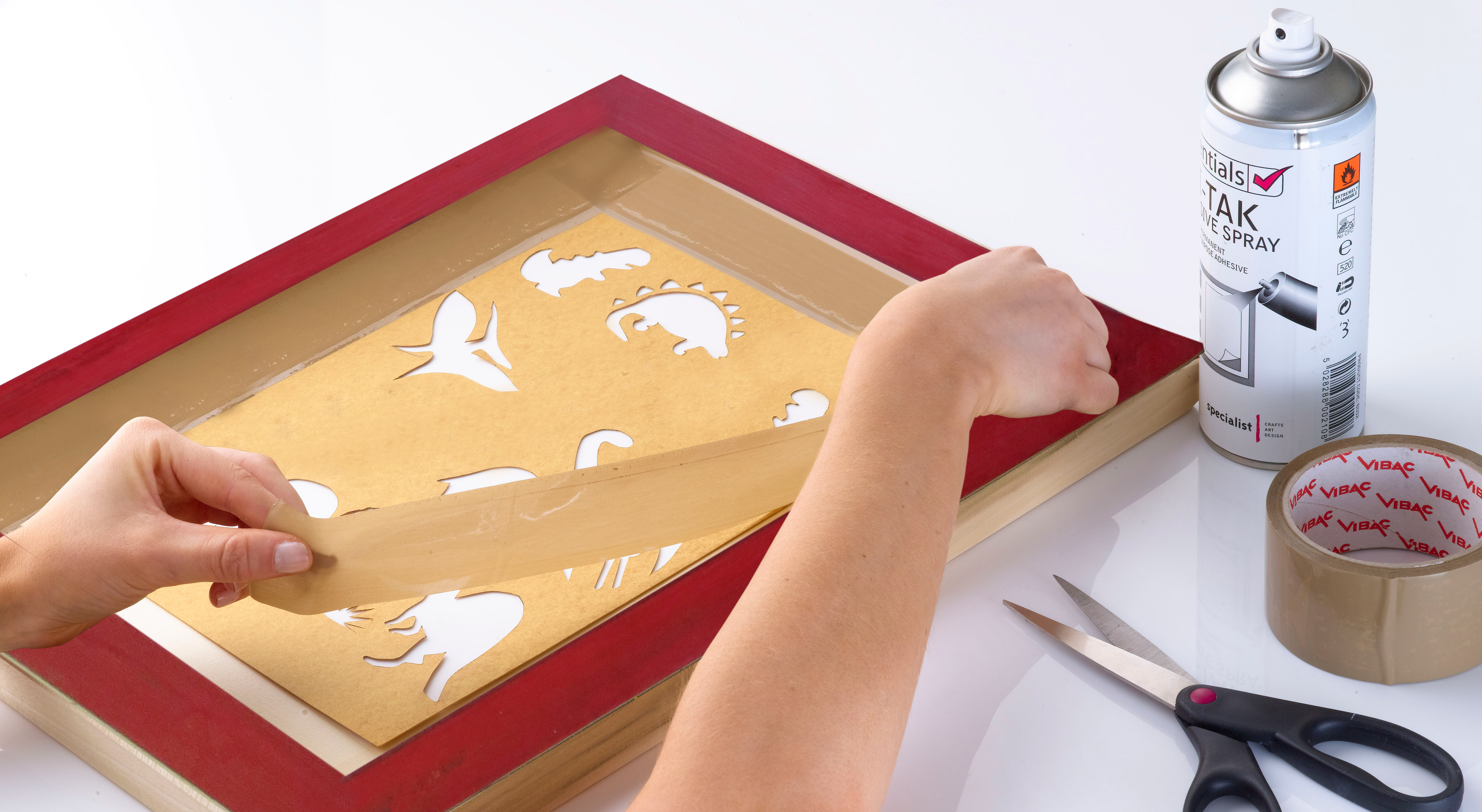 5. Lay the cut-out stencil on the mesh on the reverse of the screen and smooth all the edges down until they are flush to the mesh. To keep the stencil in position, stick the outer edges down using brown polypropylene tape. The screen is now ready for printing.